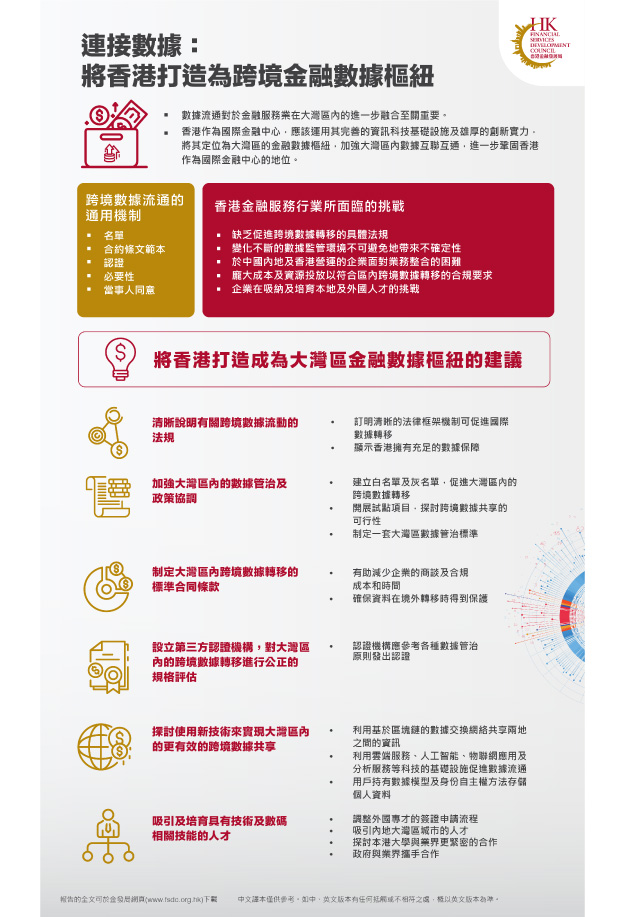 随着金融服务行业日益数码化,同时跨境交易亦显著增长,数据连接已成为全球迫切的业务需要。同样地,在大湾区内,数据的跨境流动对金融服务行业的进一步融合及连通至关重要。妥善协调的管治框架及标准可促进香港与大湾区其他城市之间的数据流通,以及应对在多个司法管辖区经营业务的营运挑战及合规的不确定性。香港是亚洲的国际金融中心,并拥有可靠的资讯及通讯技术基础设施及创新能力,因此具备成为大湾区金融数据枢纽的条件,促进区内数据的畅通流动。