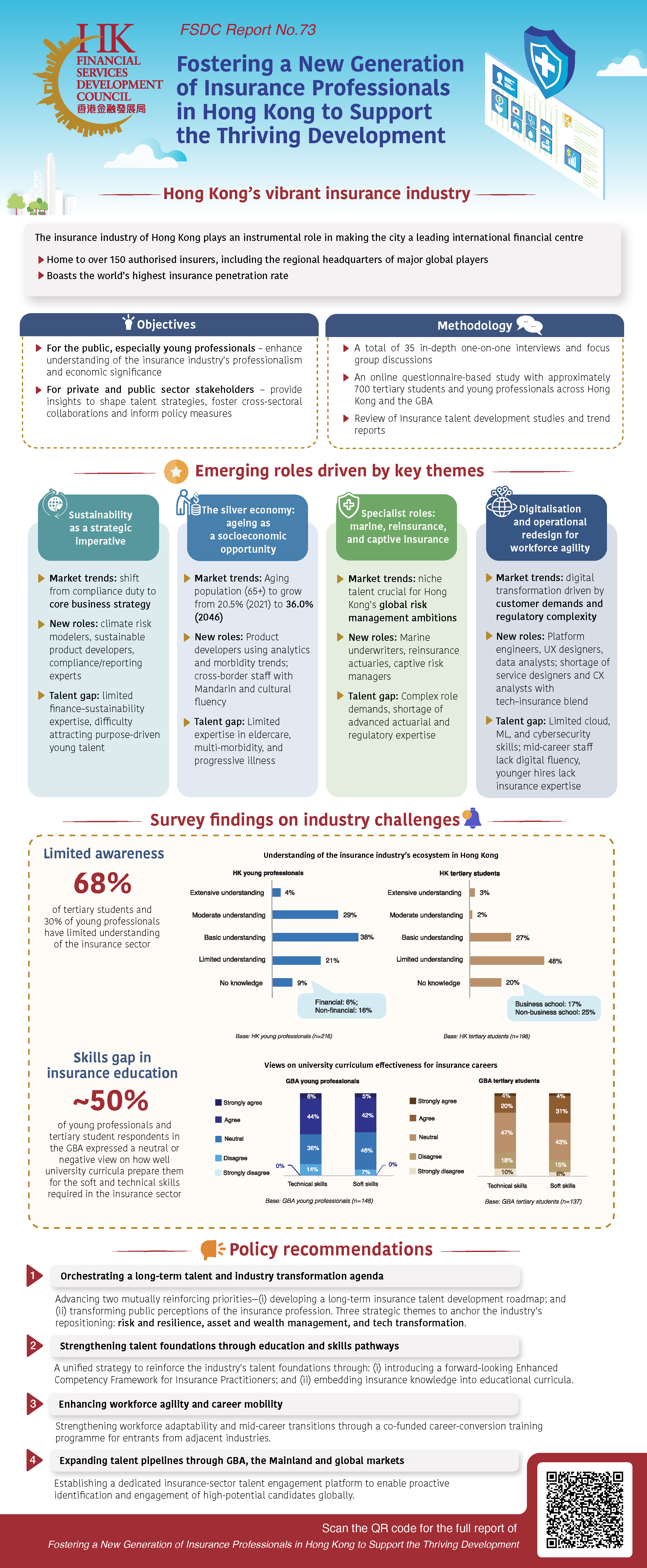 In its ongoing commitment to advancing talent development, and for the first time with a focus on the insurance industry, the FSDC formed a dedicated Working Group comprising industry experts. Through in-depth interviews with professionals and stakeholders, engagement with academia, and surveys of young talent and tertiary students in both Hong Kong and the Greater Bay Area, the Working Group assessed current and future workforce needs. This paper presents an overview of the insurance talent value chain, identifies critical skill gaps, highlights long-term career opportunities across the sector. The study aims to bridge the gap between traditional views and the modern reality of the insurance sector’s professionalism, and provides actionable insights for stakeholders to shape talent strategies that strengthens Hong Kong's position as the preeminent global insurance hub.