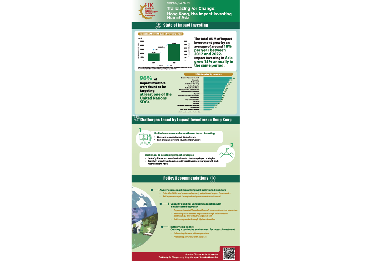 To this end, the Financial Services Development Council (FSDC) sees now as an opportune moment to accelerate the development of impact investing, leveraging its potential to drive positive change and address pressing societal challenges in the city. As such, the FSDC has formed a dedicated Working Group comprising industry experts with a view to gathering market feedback and formulating policy recommendations for the Government’s and public stakeholders’ consideration. This study aims to identify measures to promote impact investing in Hong Kong, encourage corporate and institutional participation in impact investing, and ultimately establish the city as a regional hub for impact investment.