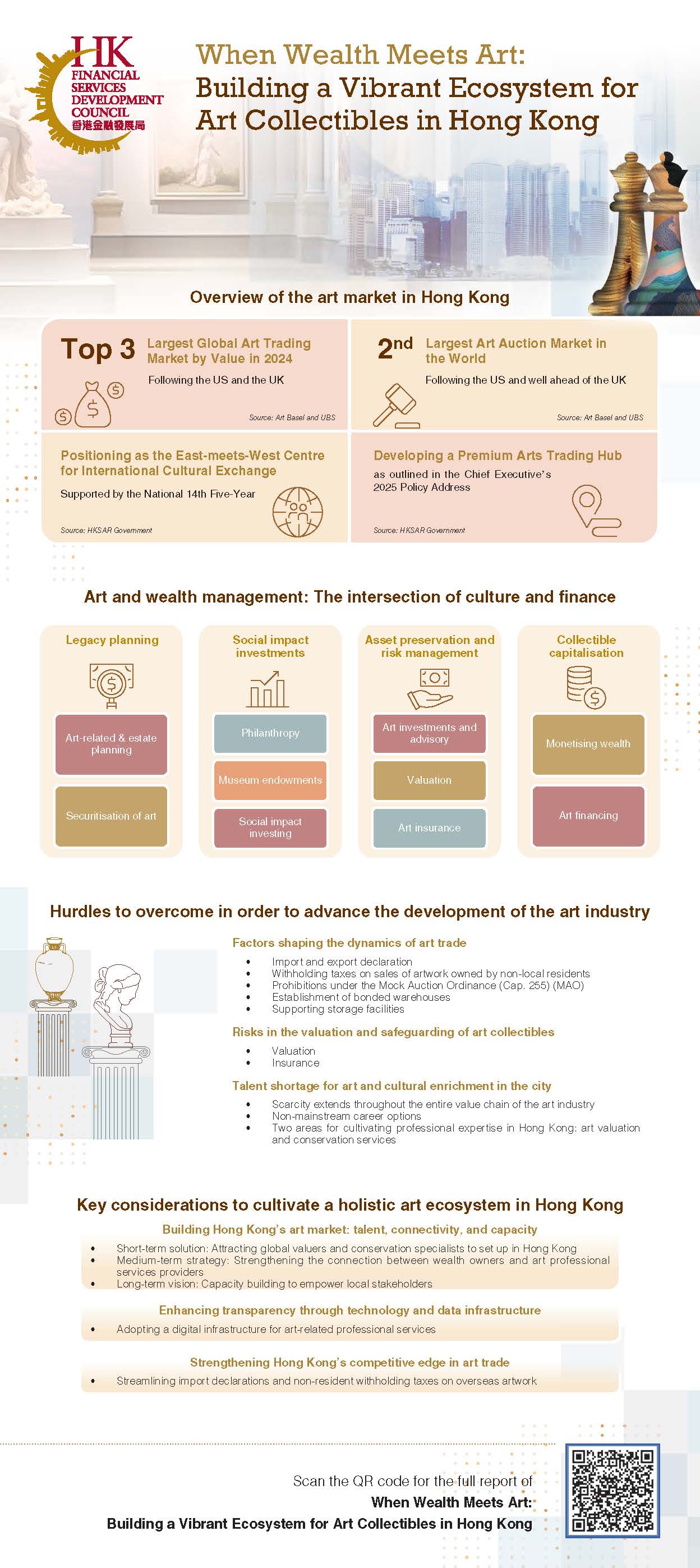 The Chief Executive’s 2025 Policy Address further reinforced this commitment by introducing a series of multifaceted initiatives aimed at enhancing Hong Kong’s role as both a cultural exchange hub and a premium arts trading centre.[3] In light of these development, the Financial Services Development Council (FSDC) believes that now is the right time to improve the art collectibles ecosystem in Hong Kong, thus strengthening the city’s position as a leading family office hub.