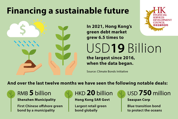 In its recently released market analysis of 2021, the Climate Bonds Initiative (CBI) highlights that Hong Kong’s green-labelled debt market last year grew to USD19 billion, growing 6.5 times on the previous year1. This represents the largest increase, in both absolute and percentage terms, since 2016, when the CBI data starts.