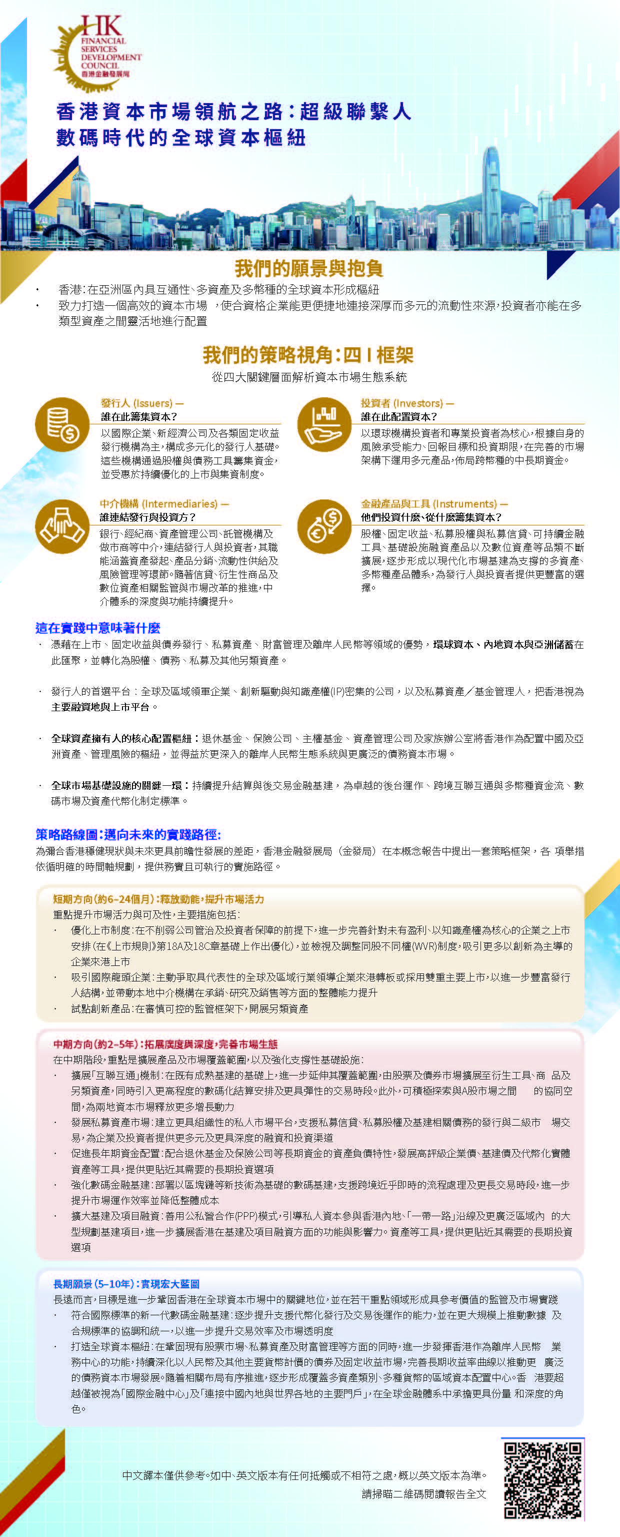 在此基礎上,本概念文件探討香港如何可超越其一向作為中國內地與世界各地主要門戶的角色,並勾劃一個更具抱負的發展定位:成為亞洲不可或缺的全球資本樞紐,讓內地與國際市場參與者能夠在此跨多種資產類別及貨幣,有效地進行資本募集、配置與循環運用。