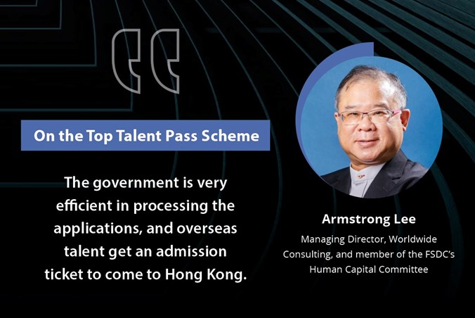 環球咨詢公司董事總經理、香港金融發展局人力資本委員會成員李漢祥先生表示:「政府處理申請的效率很高,海外人才獲得了來香港工作的入場券。」
